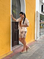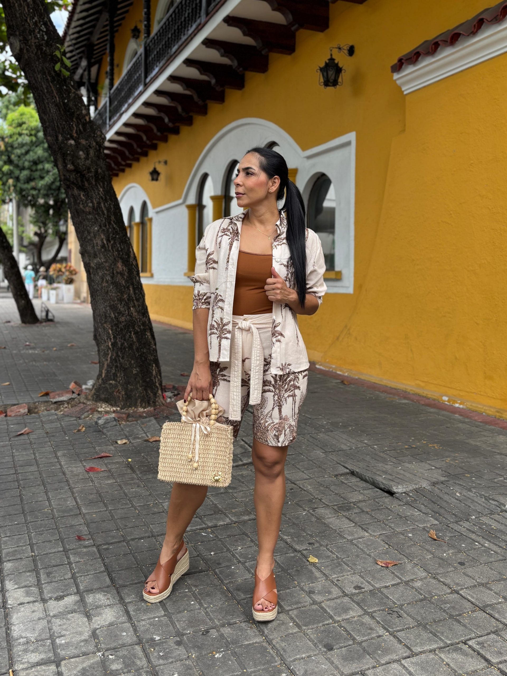 Espectacular set de dos piezas, compuesto por una camisa con abotonadura en la parte delantera y bermuda de tiro alto, que se ajusta perfecto a tu silueta, elaborado en un fresco y fino tejido estampado.