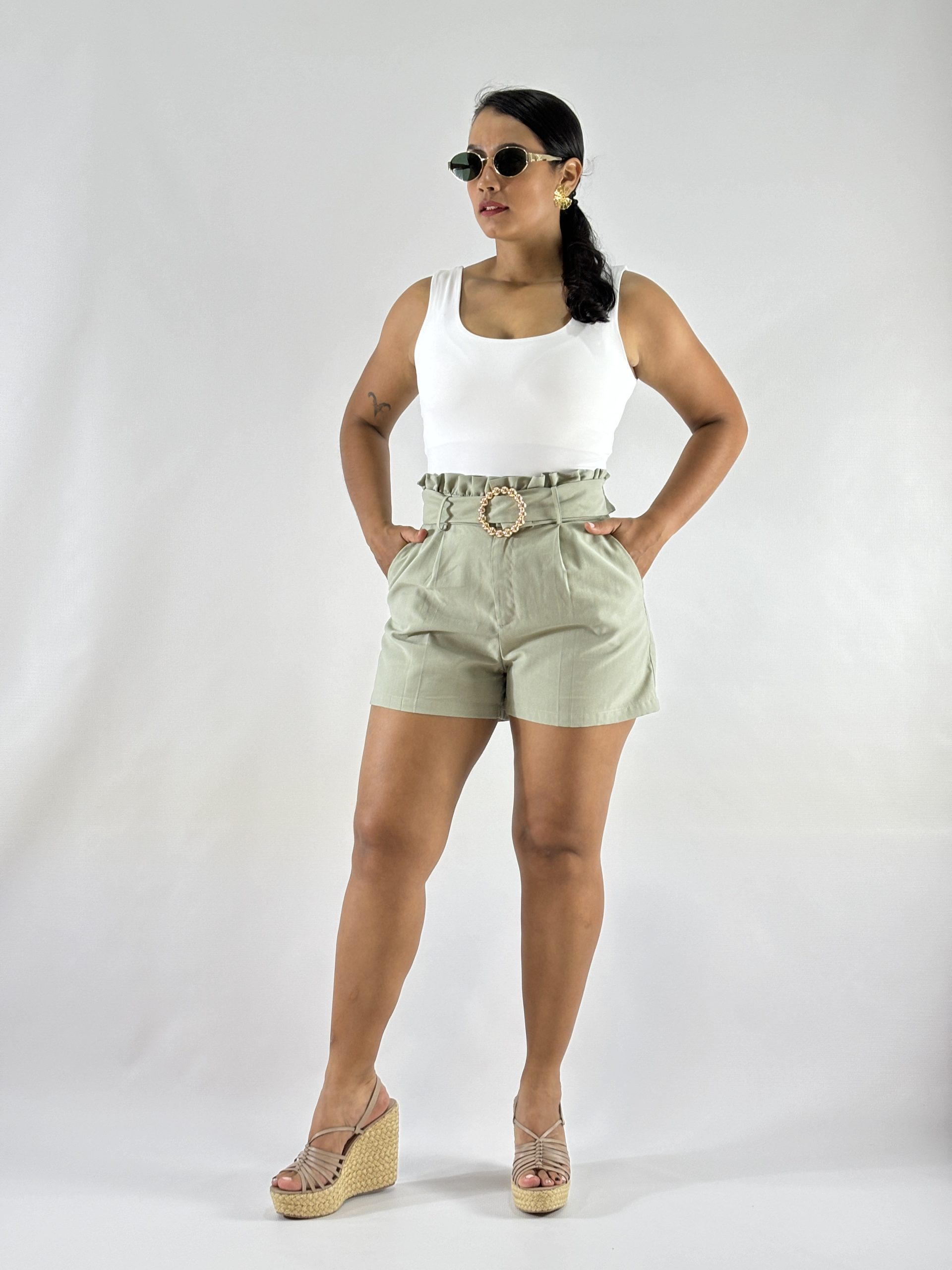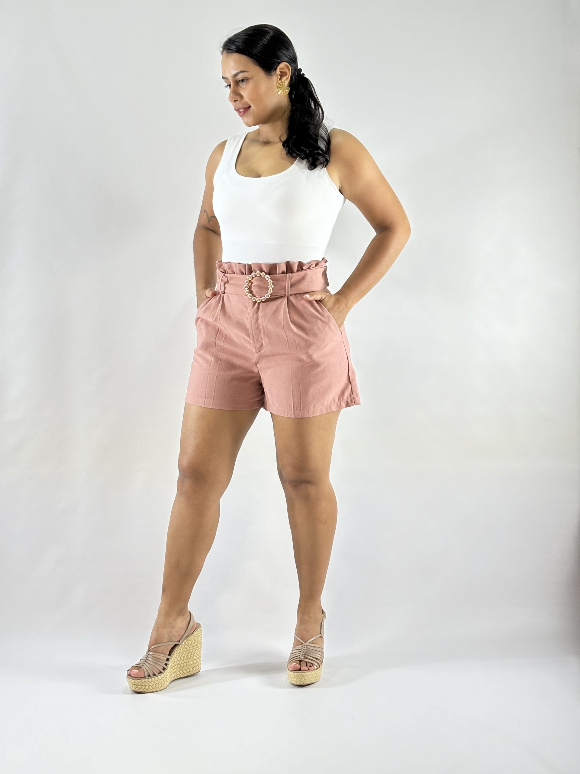 Este short de tiro alto está diseñado para quienes buscan comodidad sin perder el estilo. Confeccionado en una tela increíblemente suave al tacto, garantiza una sensación fresca y ligera en cada uso. Su horma favorecedora se adapta perfectamente a la silueta, mientras que los colores en tendencia le dan un toque moderno y vibrante. El detalle del accesorio en el cinturón añade un toque de distinción y sofisticación, elevando el look casual.