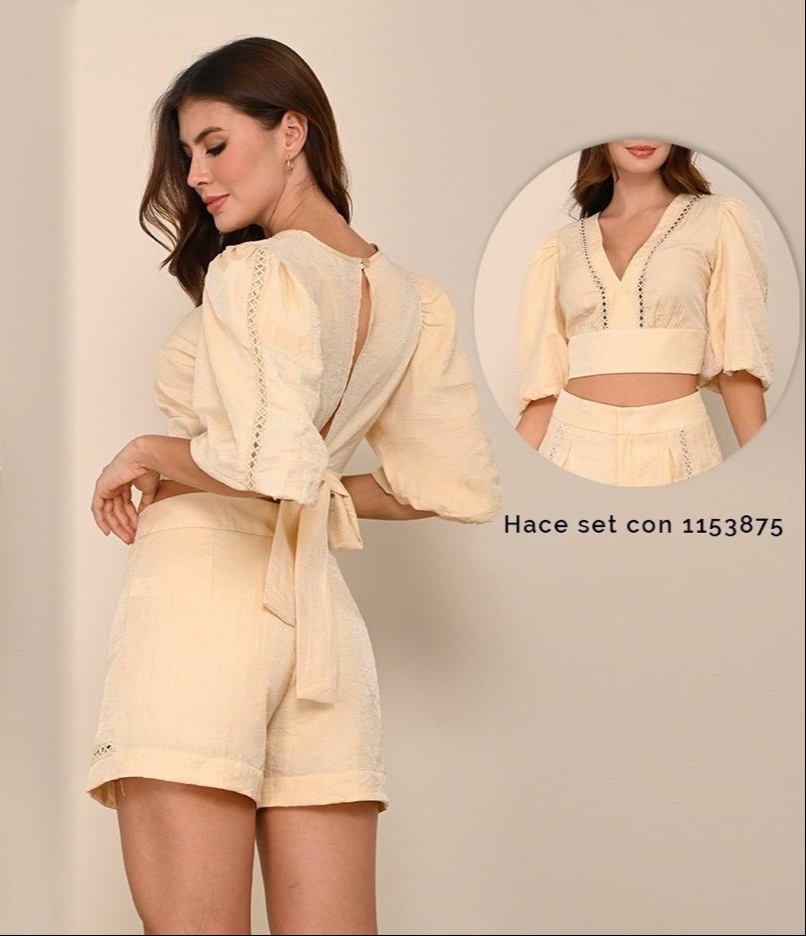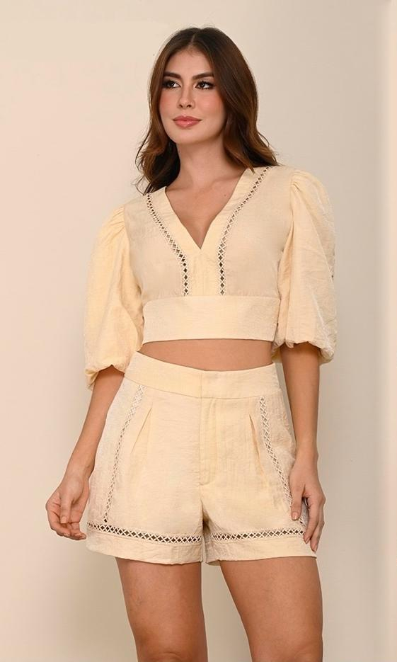 Set de dos piezas, short corto tiro alto con prenses y escalerilla en la parte de adelante.