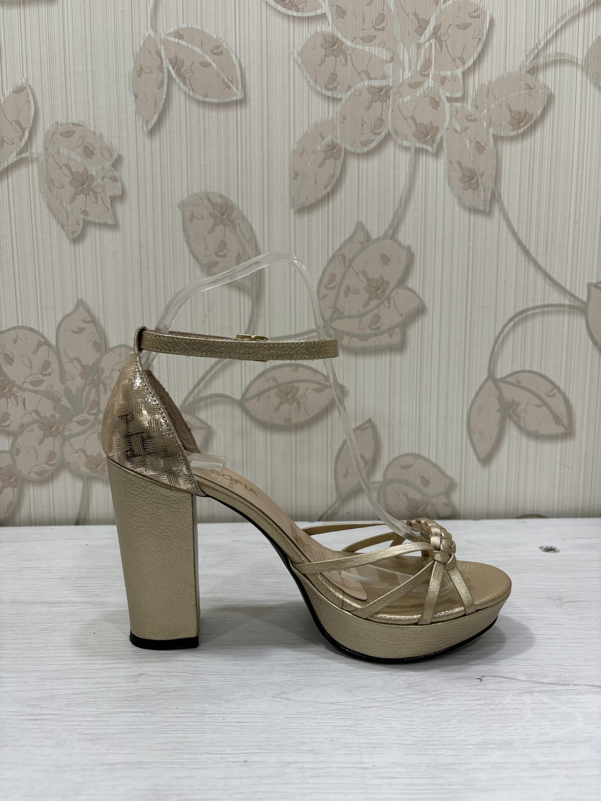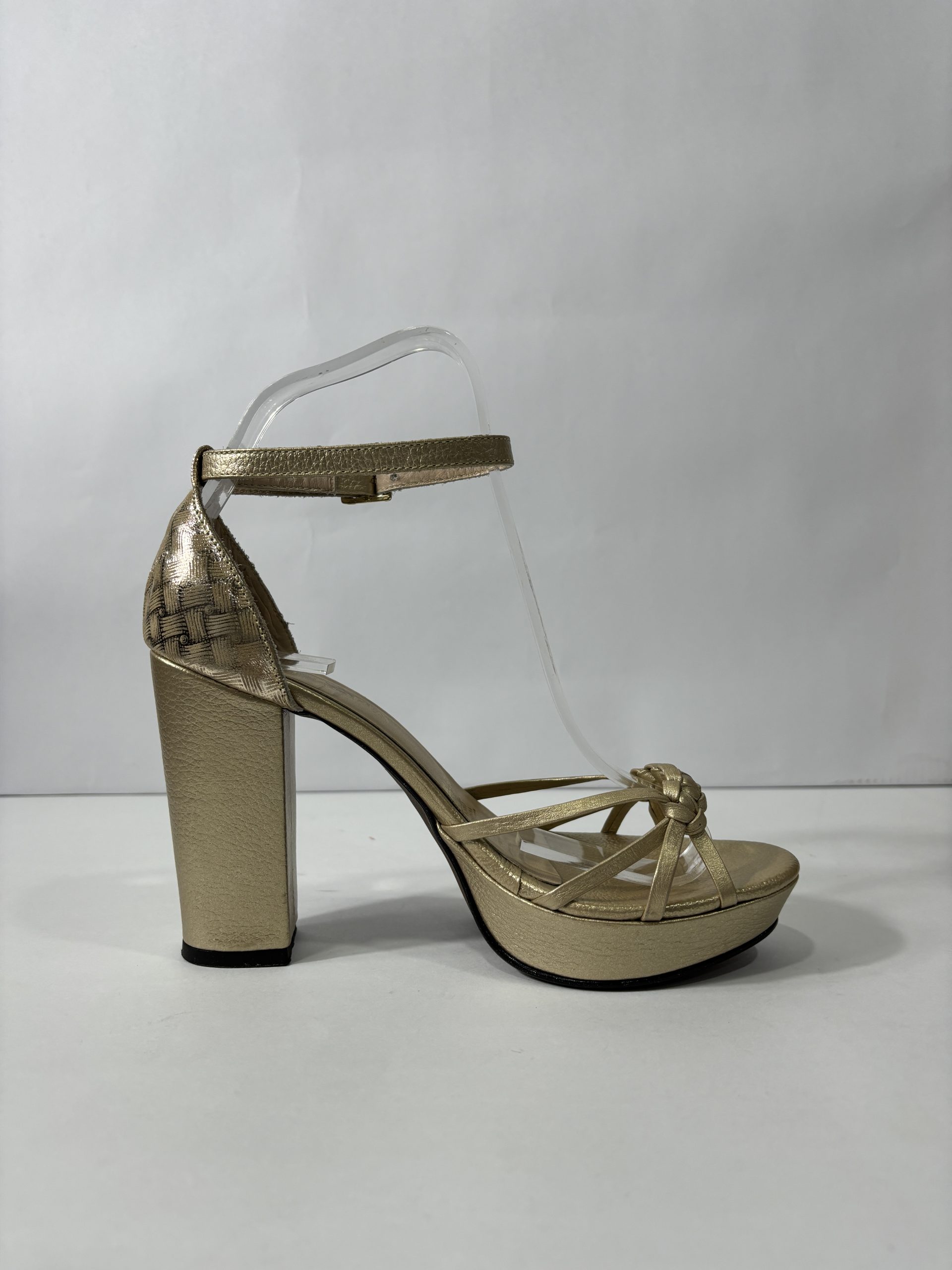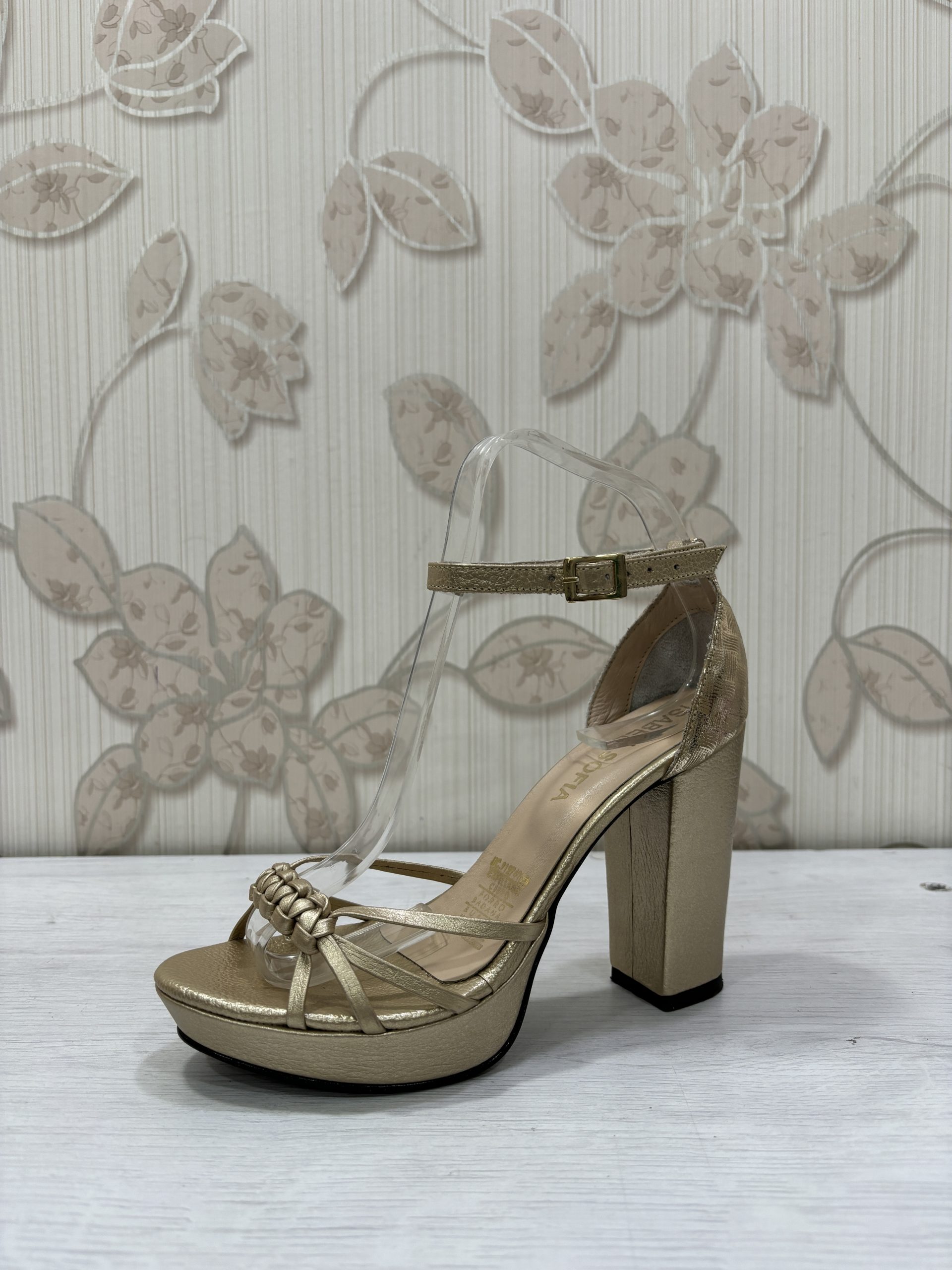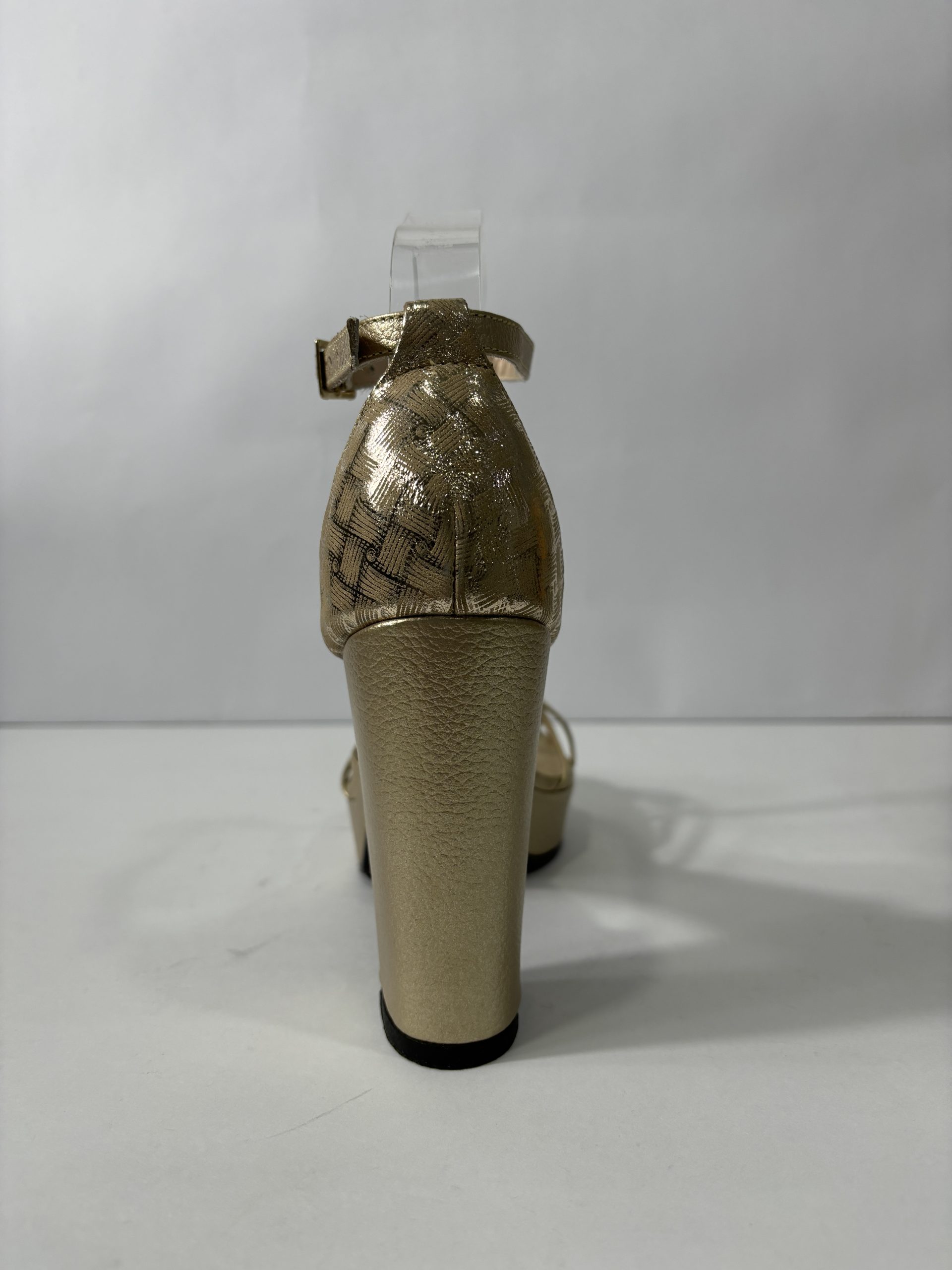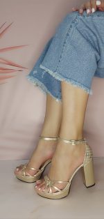 Tacón cuadrado capellada en cuero dorado. Altura 10.5 cm