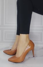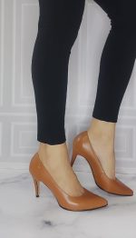 Tacón puntilla cerrado capellada en cuero color miel. Altura 7.5 cm