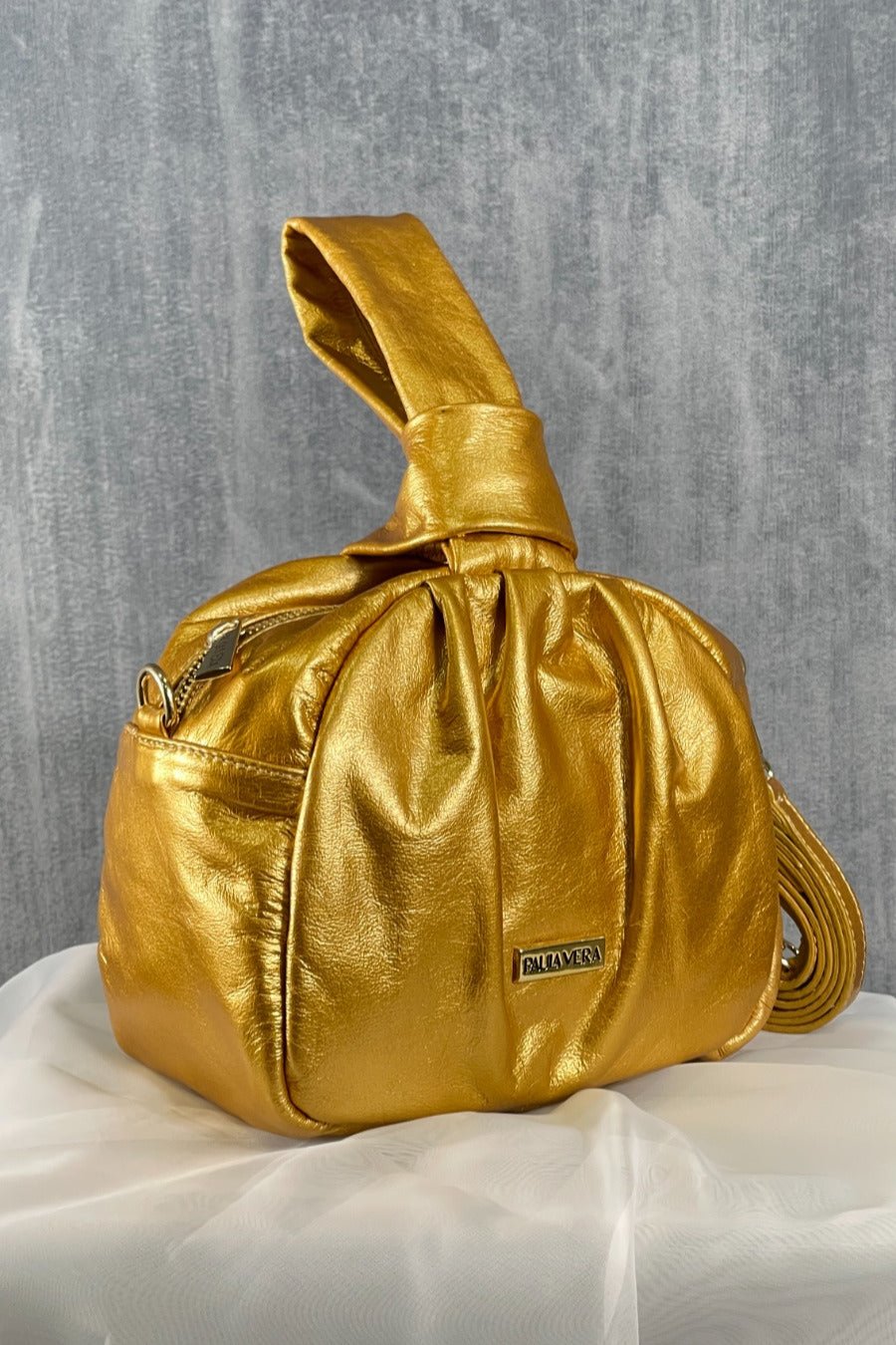 Este bolso en tono dorado brillante llama la atención por su diseño único de cierre anudado. El acabado suave y brillante del material resalta su estilo audaz y moderno. Su estructura compacta lo convierte en el accesorio perfecto para llevar lo esencial de manera sofisticada.